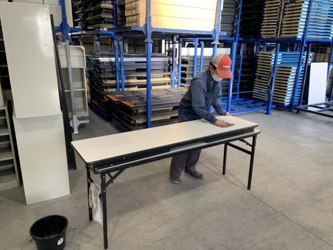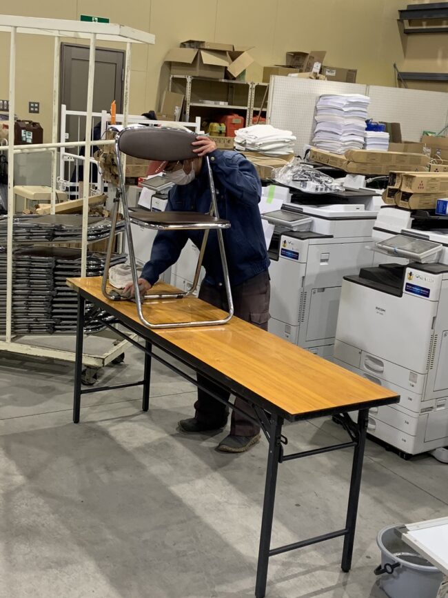 お疲れ様です。 本日は倉庫の現場についてお伝えします。 本日、倉庫の現場ではパイプ椅子の清掃や長机・ホワイトボードのメンテナンス作業をしています。 パイプ椅子のメンテナンス作業では地面に付着す…