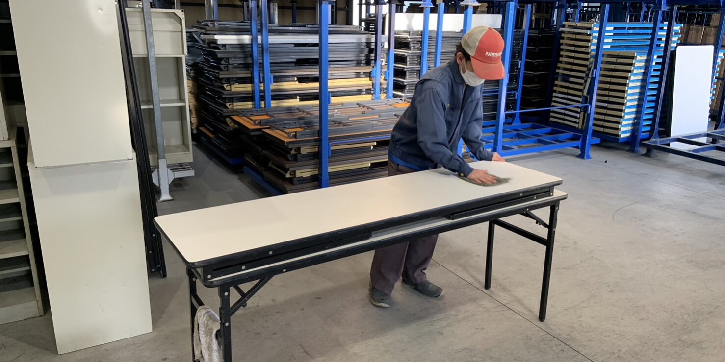 倉庫の現場は農園とは違う現場に向かい、長机や棚などをメンテナンスする作業です。