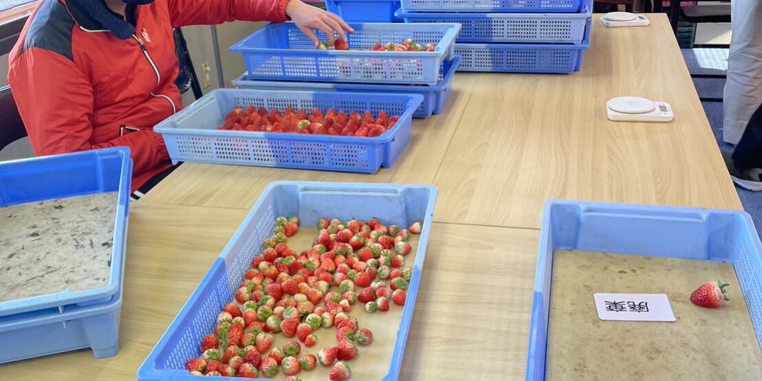 ①の写真では収穫したいちごをサイズごとに分ける「仕分け作業」をしています。