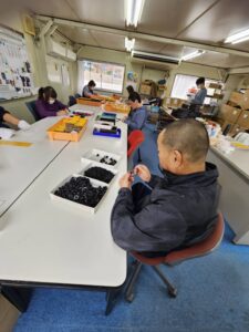 突起品にゴムをつける作業をしました。