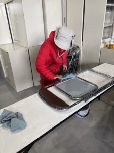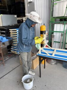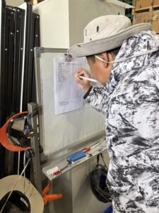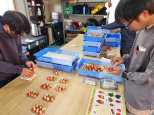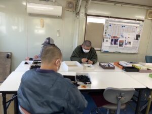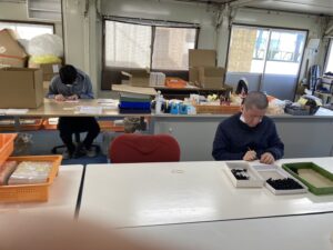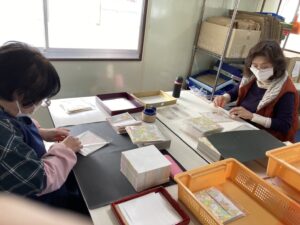折り紙の封入作業・突起品にゴムをつける作業をしました。