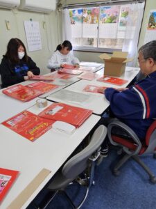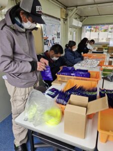 バドミントンのガット入れ・突起品にゴムをつける作業をしました。